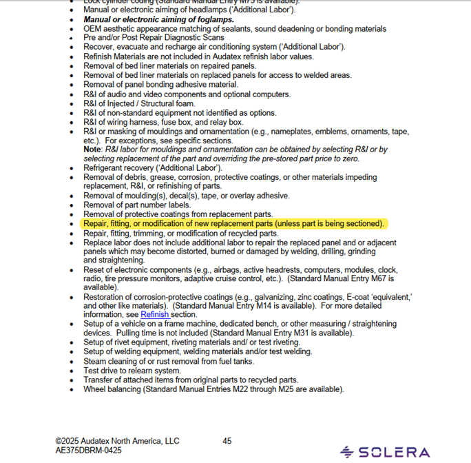 Drilling holes for license plate and bracket installation is NOT INCLUDED. Reference Audatex DBRM Section 4-2 Labor Exclusions of the DBRM. “Repair, fitting, or modification of new replacement parts”